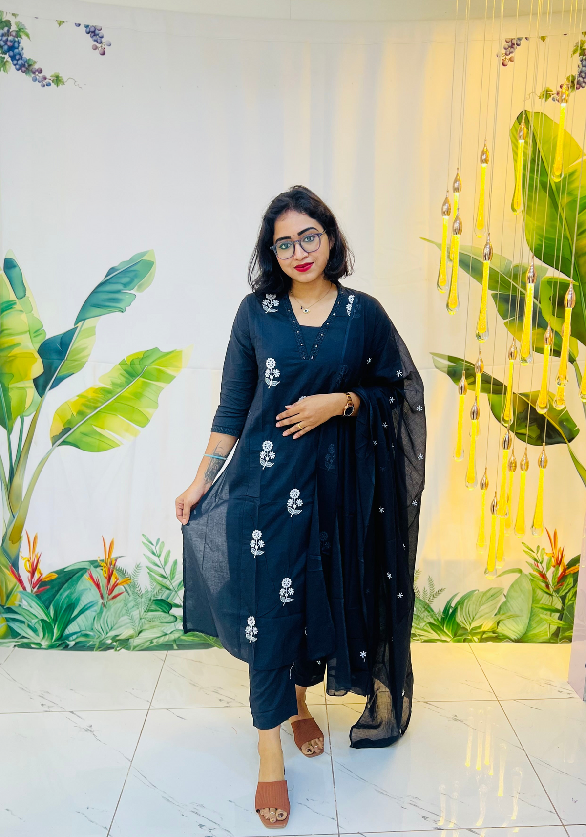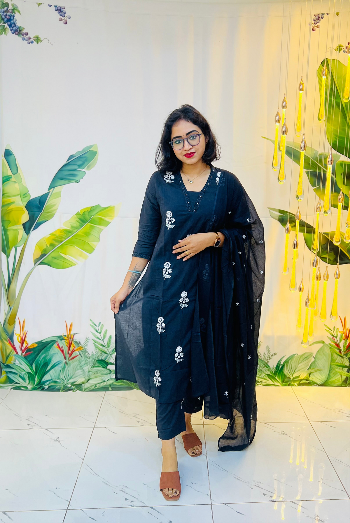 Step into effortless elegance with our Black Cotton Floral Embroidery Dress, crafted from premium breathable cotton for all-day comfort. The dress features delicate floral embroidery that adds a touch of charm and femininity, making it perfect for both casual outings and festive gatherings. With its soft silhouette, comfortable fit, and timeless black hue, this piece beautifully blends traditional craftsmanship with modern style.