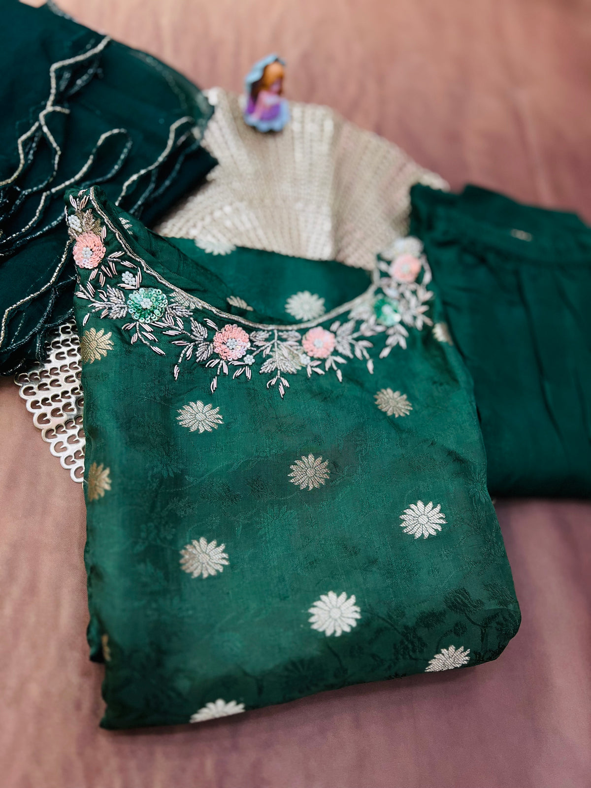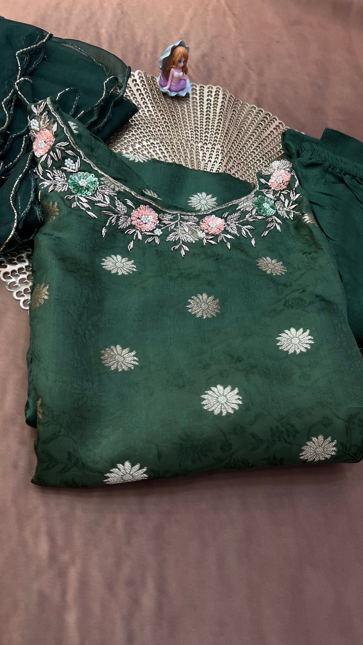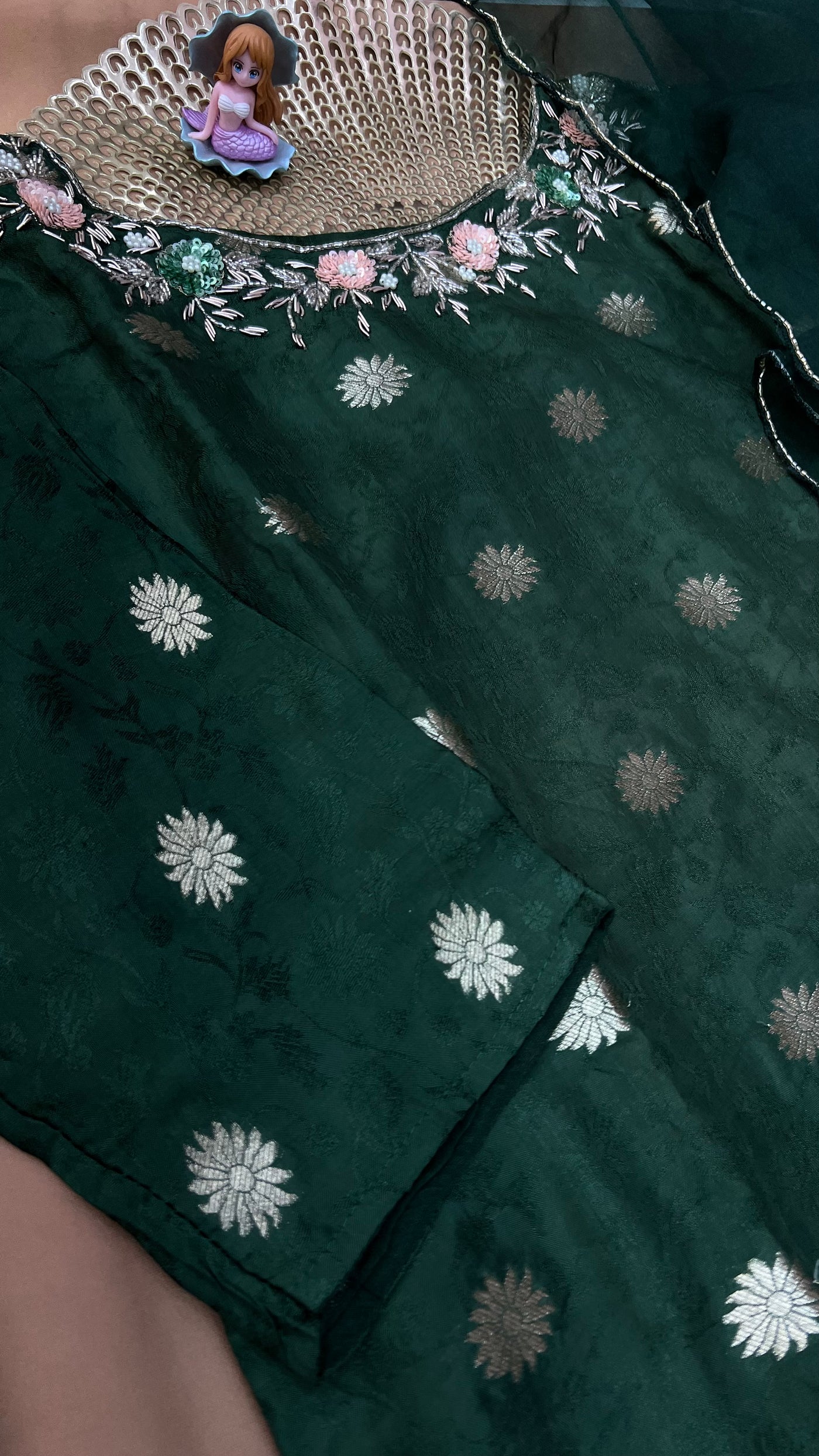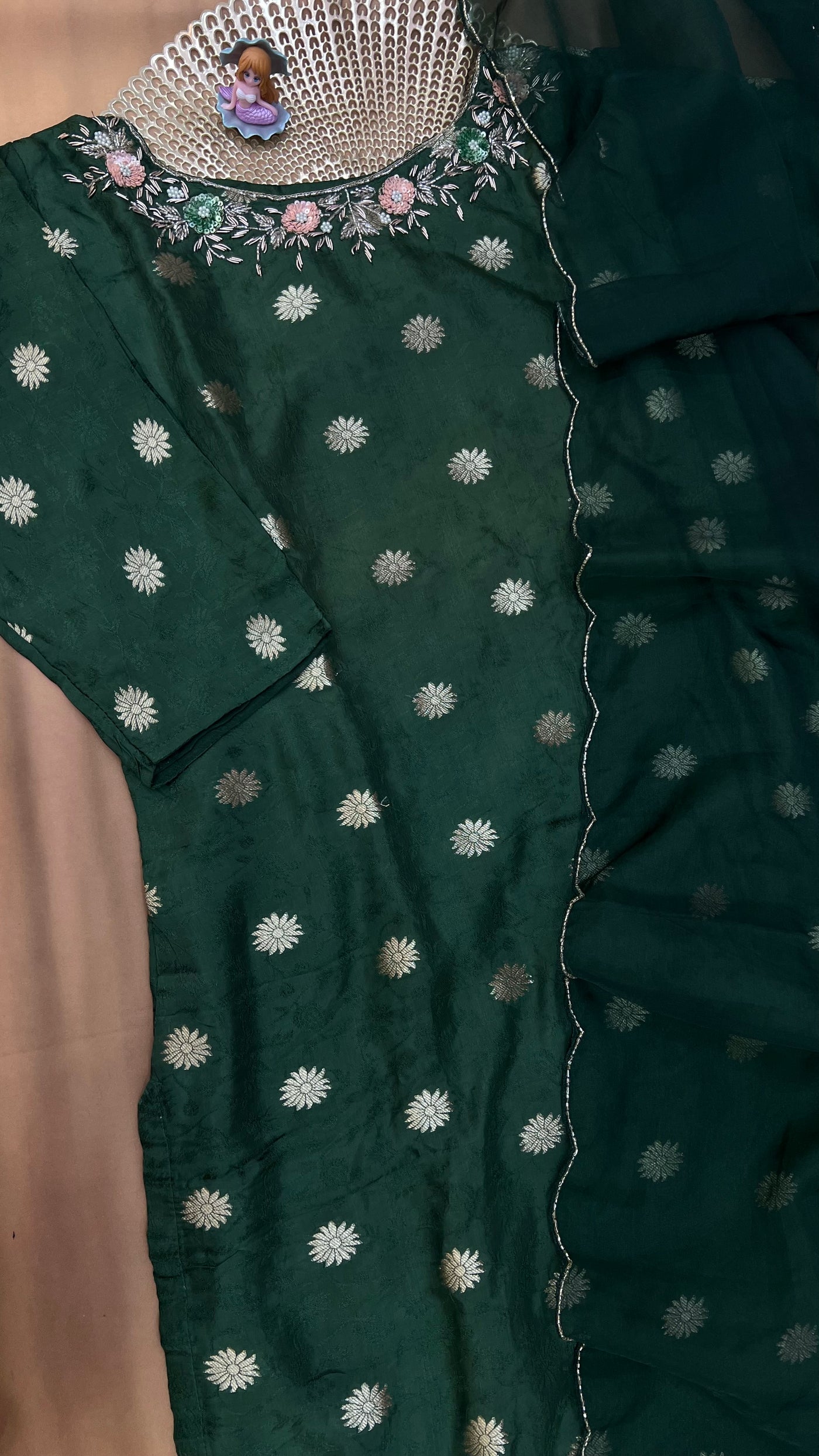 Elegant emerald green kurti adorned with silver zari floral motifs and a beautifully embroidered neckline. Paired with a matching dupatta featuring delicate scalloped edges for a graceful festive look.