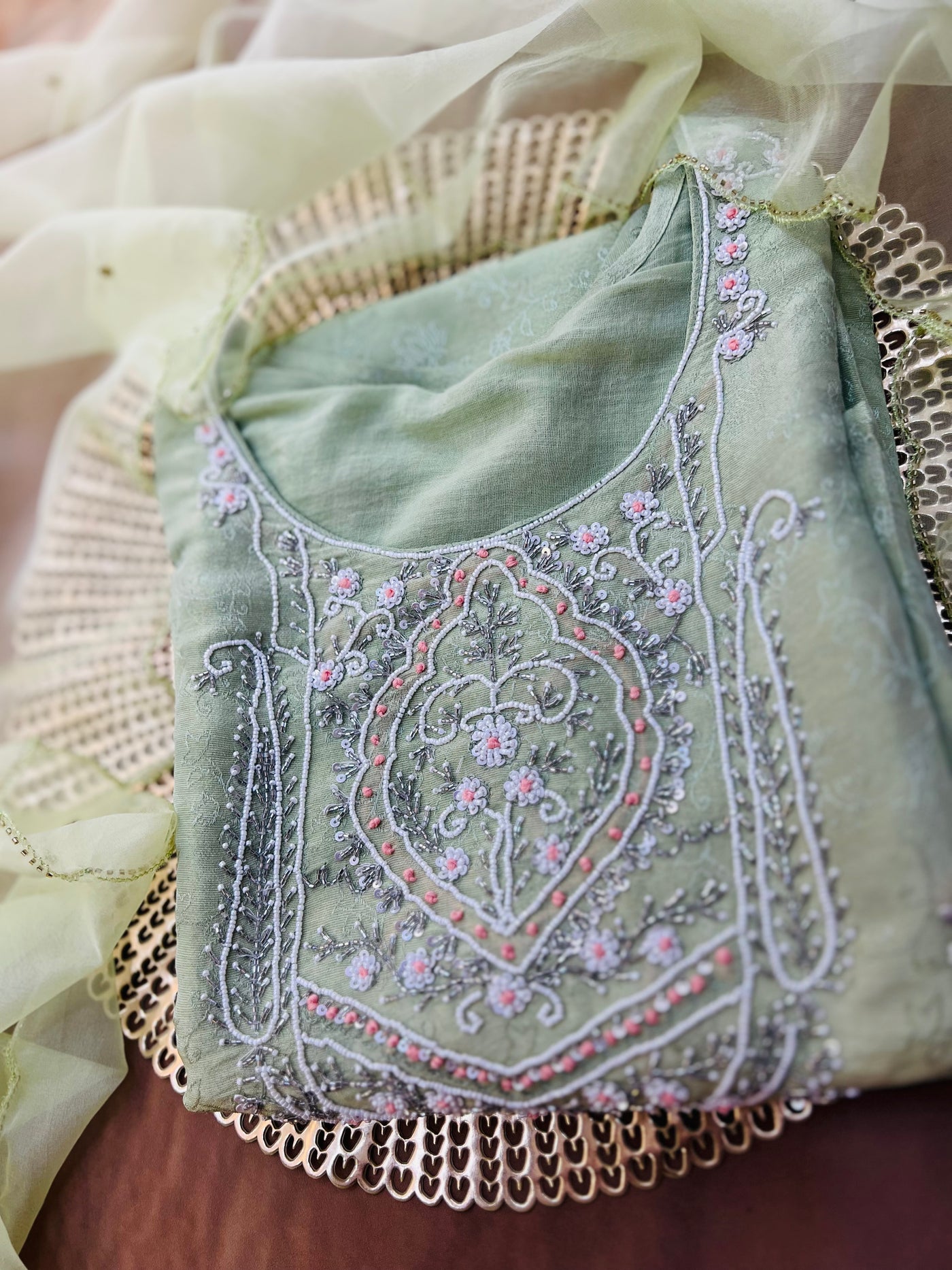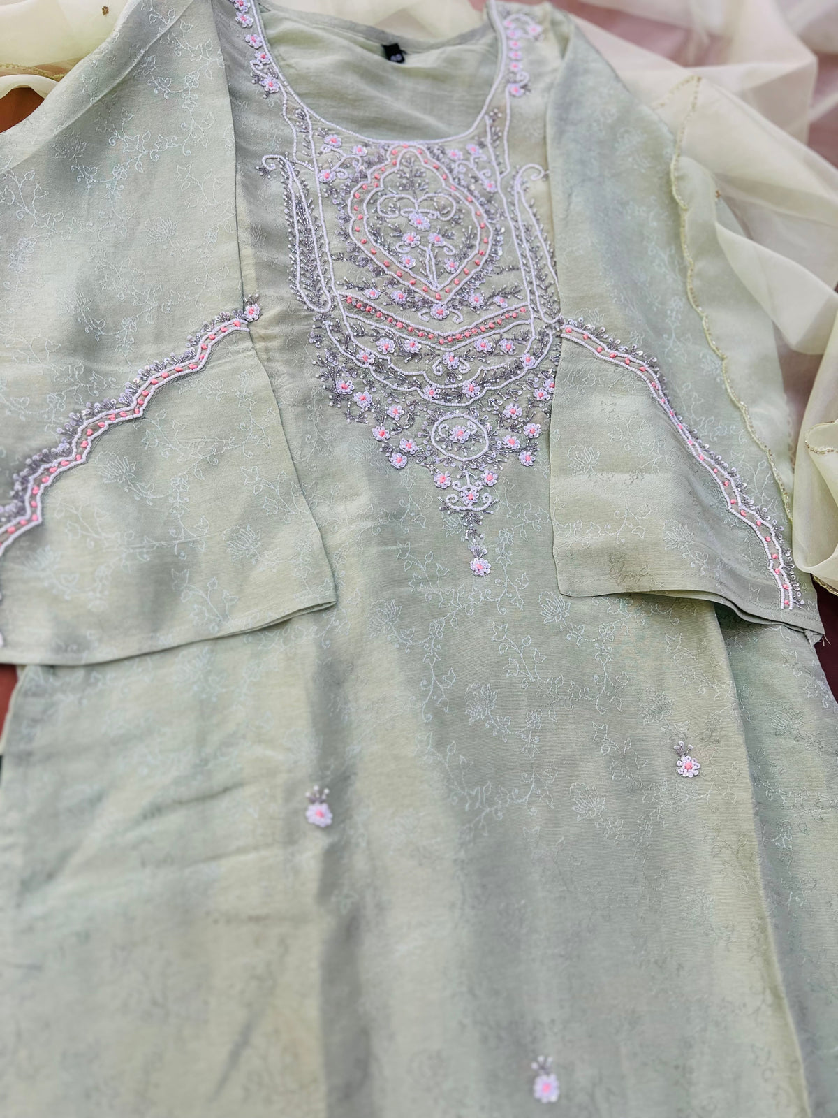 Pastel Green Embroidered Kurti Set with Floral Detailing