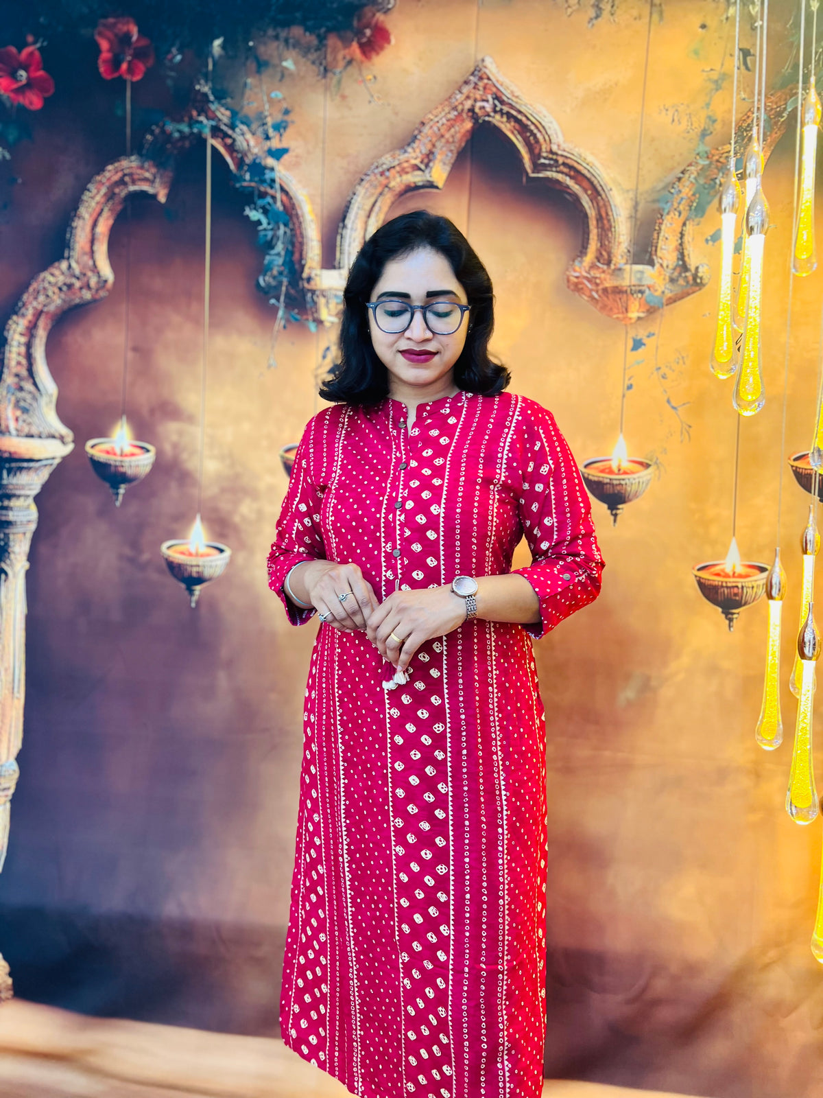 Step into traditional charm with this stunning red Bandhej-style kurti. Adorned with intricate white tie-dye patterns, it beautifully captures the essence of Indian artistry. The straight-cut design with a mandarin collar and three-quarter sleeves adds a touch of modern grace. Made from soft, breathable cotton, it ensures both comfort and elegance for any occasion. Perfect for festive gatherings or casual outings, pair this kurti with white or beige bottoms for a timeless ethnic look.