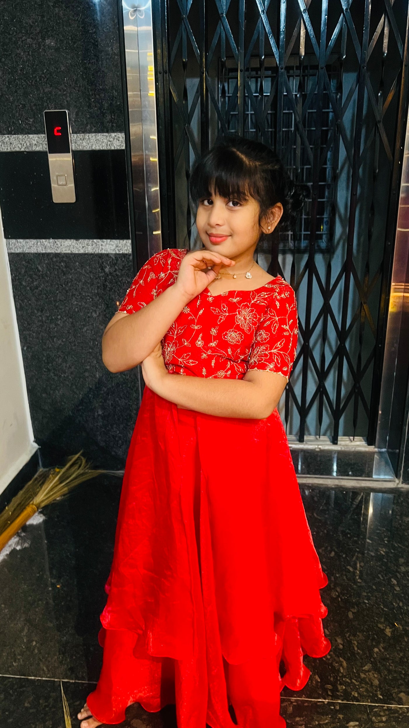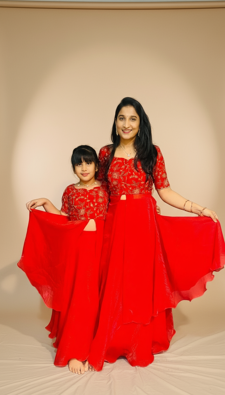 Celebrate the bond of love and elegance with this stunning mother-daughter matching gown set. Crafted in a vibrant red hue, these floor-length dresses feature intricately embroidered floral bodices that exude grace and charm. The flowing georgette skirts add a soft, layered drape, creating a picture-perfect twirl. Designed for festive occasions, weddings, or photoshoots, this ensemble beautifully captures timeless elegance and the warmth of togetherness. A perfect blend of style and sentiment for every special moment.